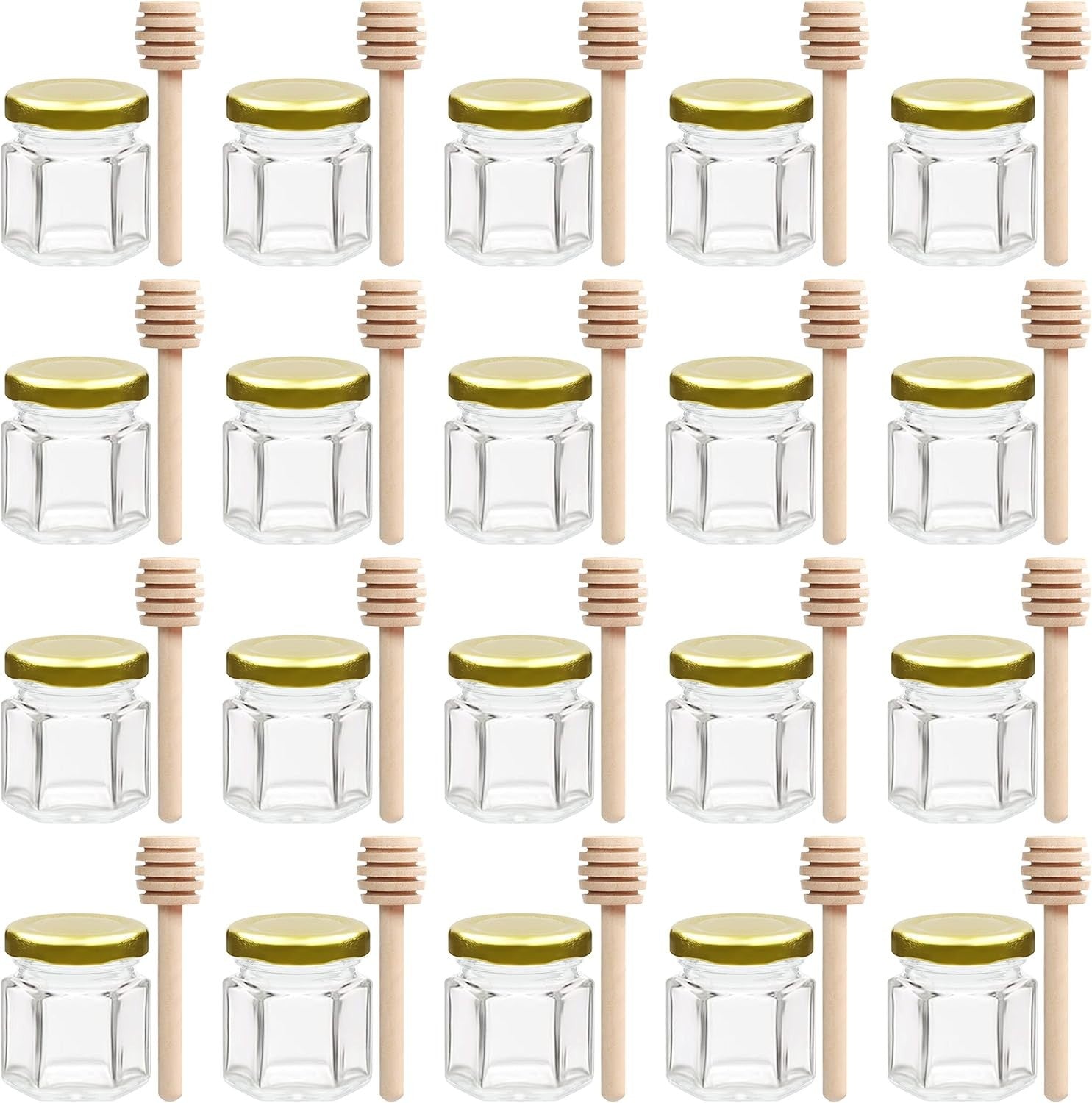 20 GLASS HONEY JARS: Included in this set are 20 cute glass honey pots with lids and wooden drizzlers for storing and serving honey. Every pot is made from high-quality glass that is strong and durable. All the hexagonal jars measure 4.6cm (1.81 inches) in diameter and 5cm (1.97 inches) in height, with an opening diameter of 3cm (1.18 inches). Each jar can hold up to 40ml (1.4oz). The drizzles are made from 100% natural schima superba wood and measure 8.3cm (3.27 inches) in length.