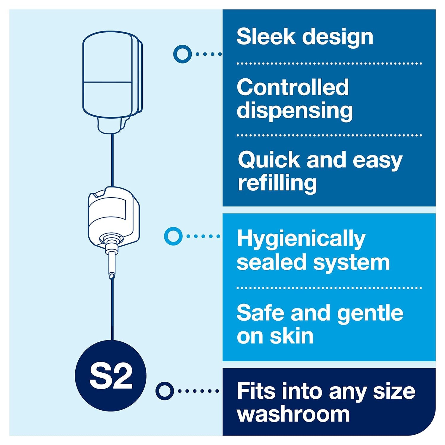 The Tork Mini Liquid Soap Dispenser in Elevation Design fits into any size washroom and can be used with a wide range of Tork skincare products in sealed bottles. It is easy to use and provides excellent hygiene. Elevation dispensers have a functional and modern design, that makes a lasting impression on your guests.